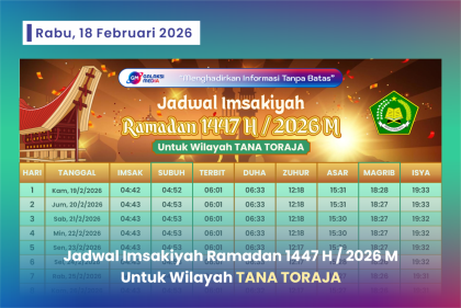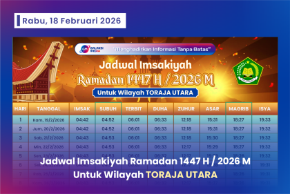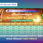 Seputar Toraja Jadwal Imsakiyah Ramadan 1447 H/2026 M untuk Wilayah Tana Toraja – Download PDF February 18, 2026 • 9 Views • Pemerintah melalui Kementerian Agama Republik Indonesia telah menetapkan awal Ramadan 1447 Hijriah melalui sidang isbat...
